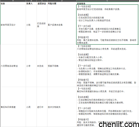 在项目跟进表中的总结报告列,调用AI总结函数,并下拉拖动,就可以实现批量生成的效果