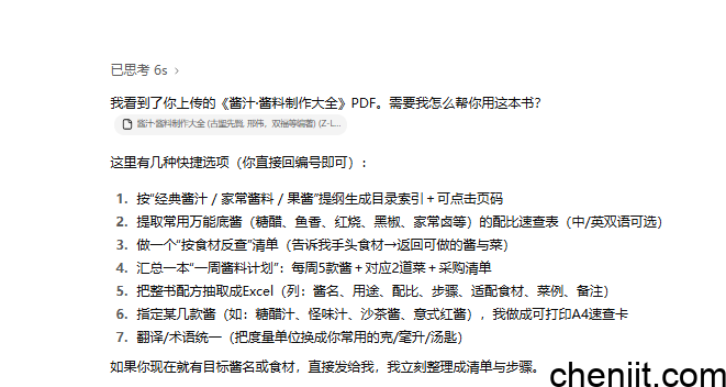 支持常见格式:Word、Excel、PDF、图片、代码文件等。上传后它能提取内容、总结要点、生成报表或转换格式。例如我上传一本酱料制作相关的电子书,它能识别并学习其中的内容,让后续的回答更加精准。