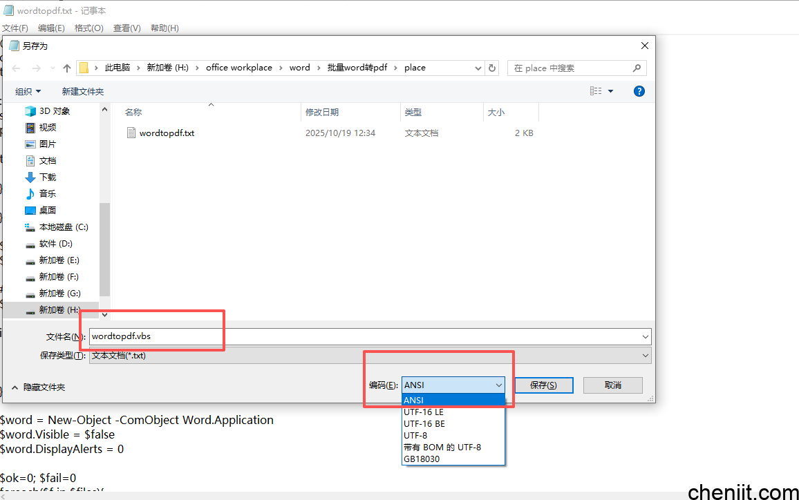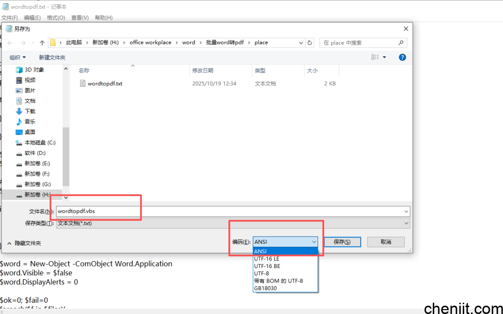 第二步,将文件另存为wordtopdf.vbs,这里有一点需要注意,编码选择ANSI